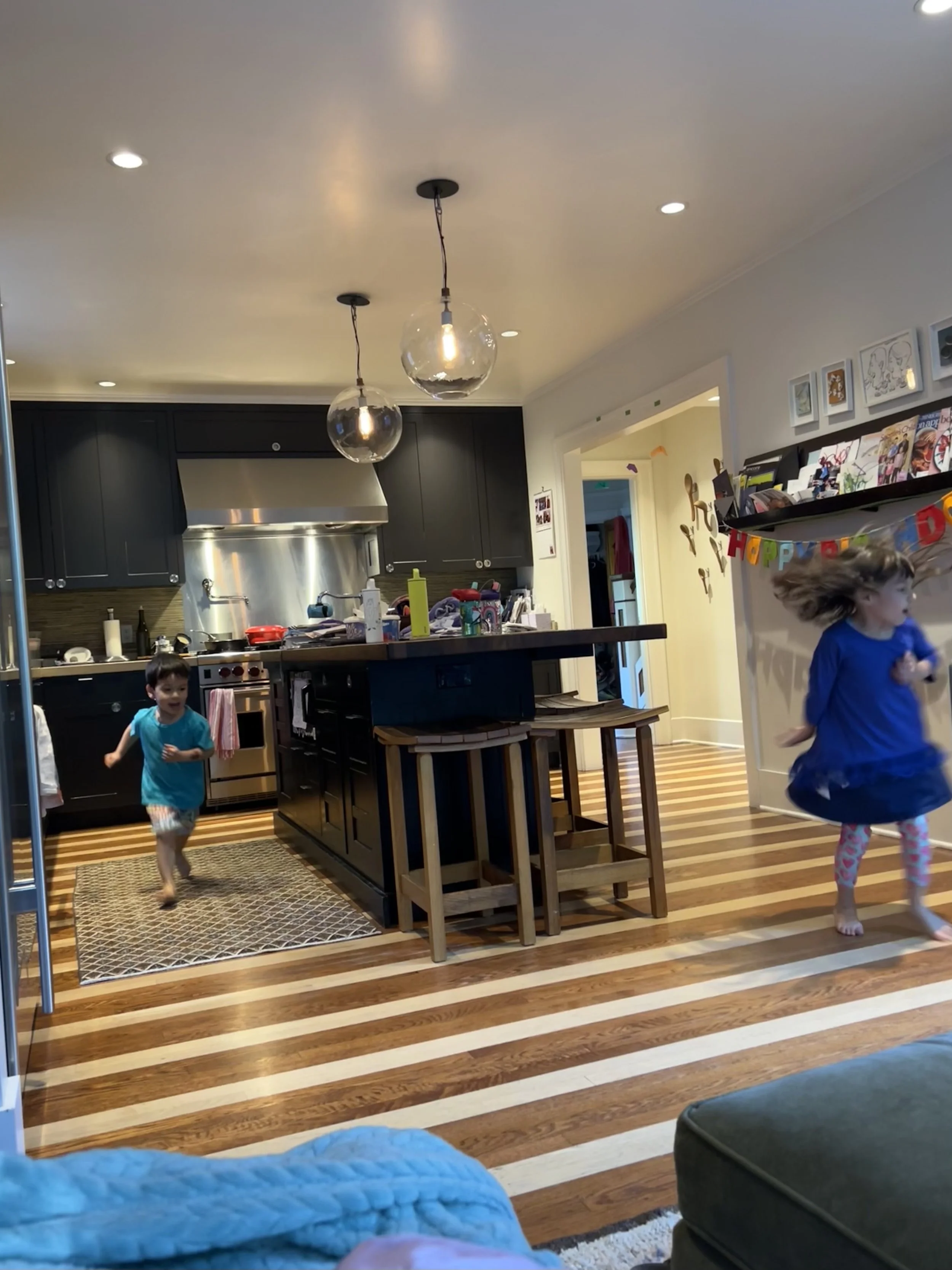 The kitchen has become host to a post dinnertime track meet this week, running nightly. Holmes is learning how to pump his arms to go faster. Meryl is practicing her inside lane passing skills while twirling around the bend. The heat turns up, clothes come off, and…we’re so glad to have a couch in the kitchen to watch the scene!